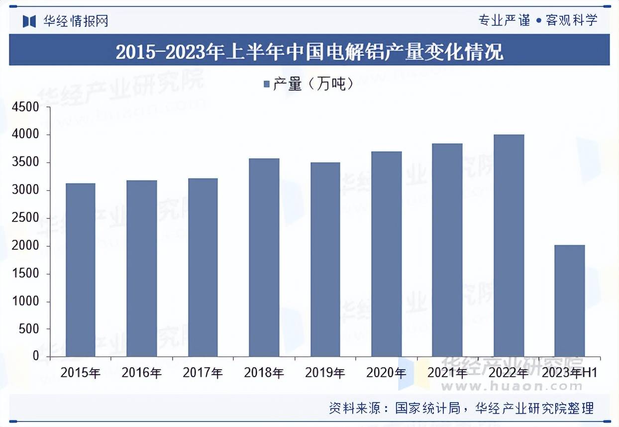 在国内,在石油焦下游需求行业里,电解铝比重占据首位,电解铝市场是决定石油焦上升空间源原动力。中国是全球最大的电解铝生产国和消费国,近年来国内电解铝产量持续增长。根据国家统计局数据,2022年,中国电解铝年产量突破4000万吨,为历史新高,2015至2022年期间复合年增长率为3.6%。2023年上半年产量为2016万吨,较2022年同期增长2.44%。在政策的严控下,预期未来行业产量提升空间有限。