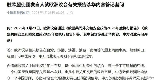 面对欧洲议会的错误言论和“”势力的嚣张气焰,中国驻欧盟使团第一时间发表声明,明确表示强烈不满和坚决反对。