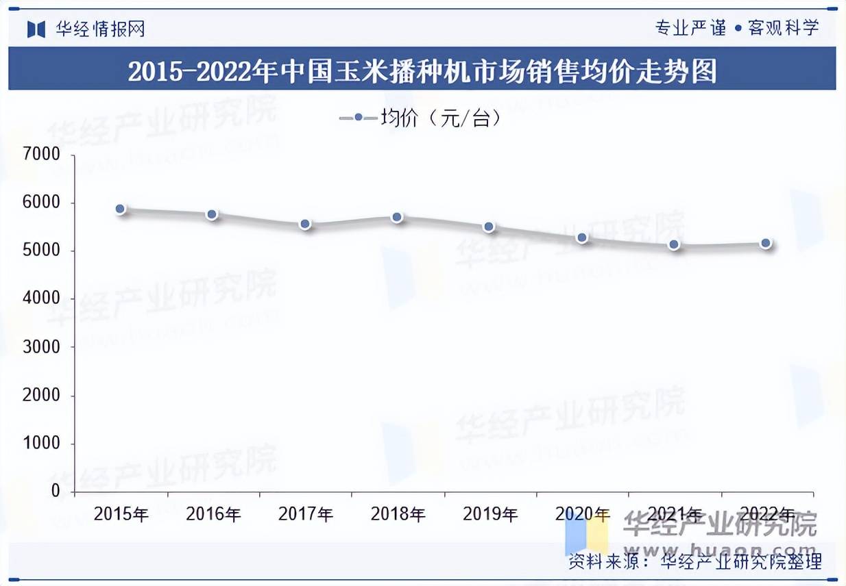 随着玉米播种机技术的不断成熟,近年来我国玉米播种机市场销售均价呈现出震荡下行趋势,2015年玉米播种机市场均价约为5845元/台,2022年下降至5145元/台。