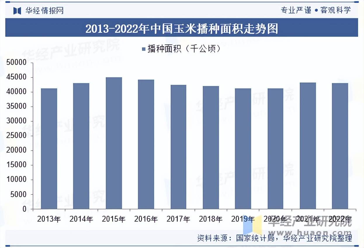 玉米的种植一直是农业生产中的重要环节。2015年我国进行供给侧改革,开始调减玉米种植面积,2016年玉米临储政策取消后,玉米种植面积下滑;2021年受国家政策鼓励以及玉米价格上涨等因素影响,我国玉米种植面积有所扩张,增长至4332.4万公顷,相较2020年增长5%;2022年,我国玉米播种面积达到4307万公顷,同比下降0.59%。