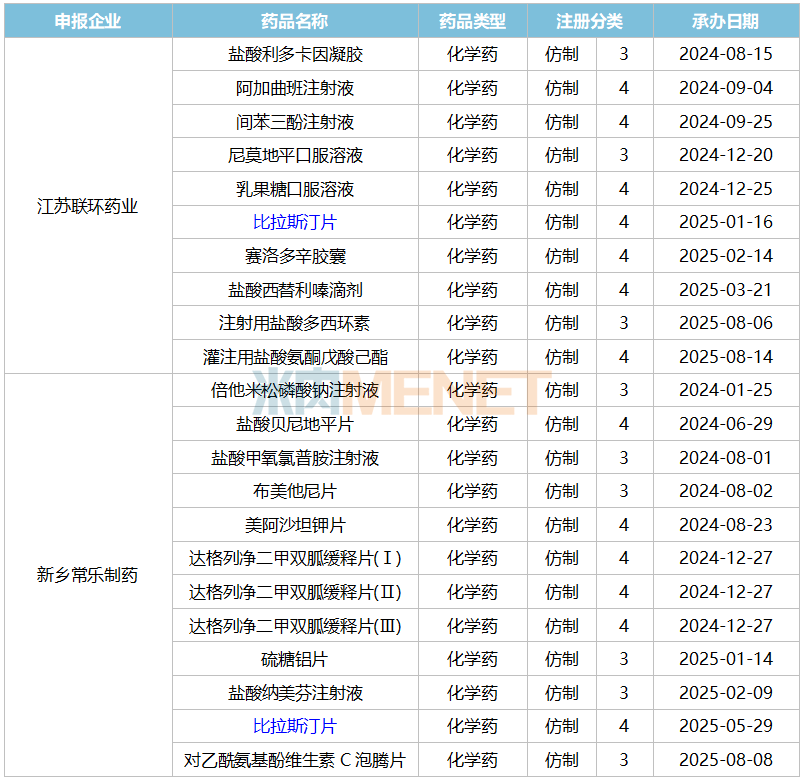 2024年至今,江苏联环药业有10个仿制药新品报产在审,新乡常乐制药有12个仿制药新品报产在审,仅比拉斯汀片是双方都申报产品。