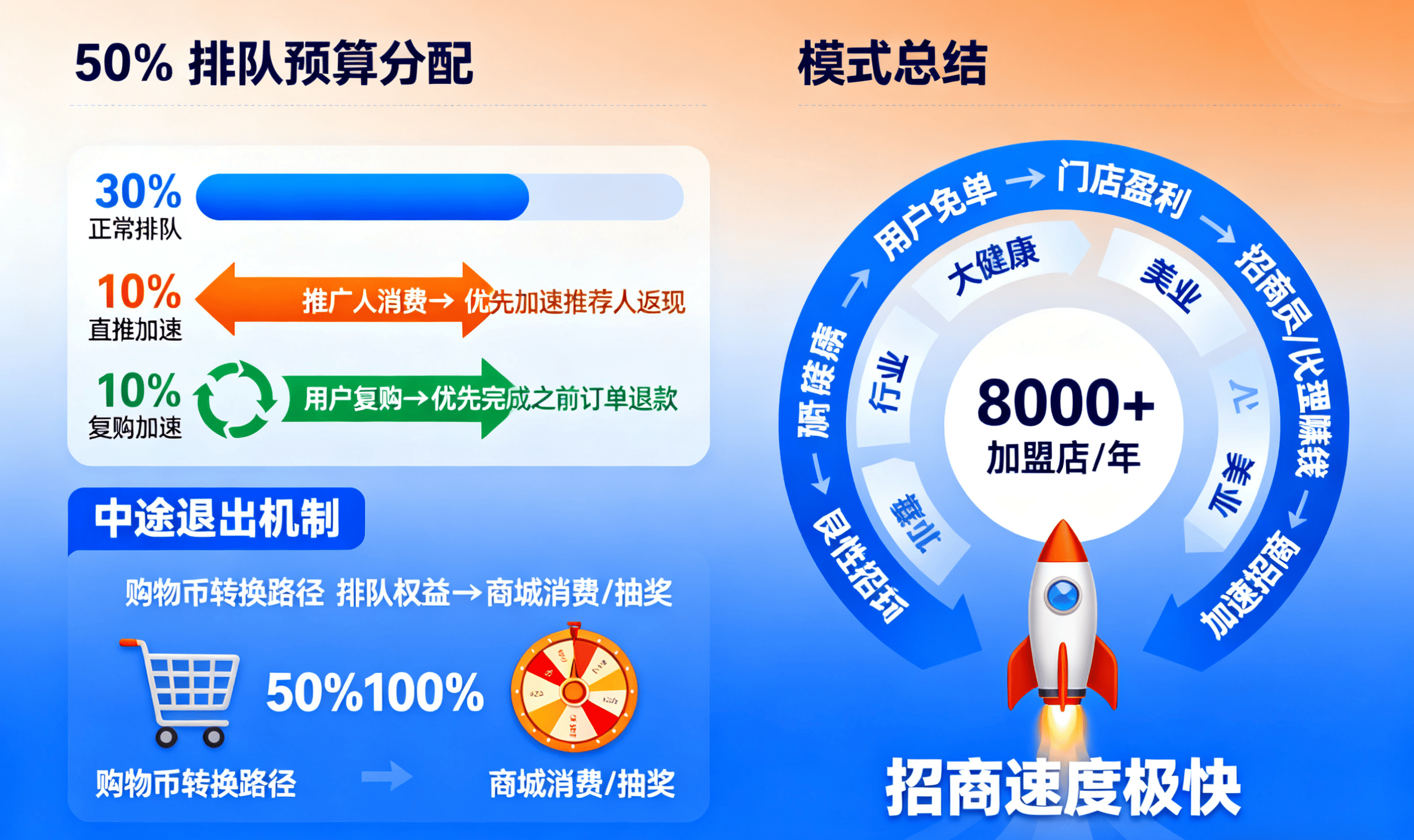 总结来看,此排队免单消费模式从用户免单消费入手,改变消费观念,拉动消费。用户免单,门店盈利,进而带动招商员和区域代理赚钱,形成良性循环,招商速度极快。若做好概念塑造、运营和招商工作,该模式非常适合在大健康、美业等行业落地复制加盟店。就像这个案例,不到一年就复制了 8000 多个加盟店,其他模式难以企及。