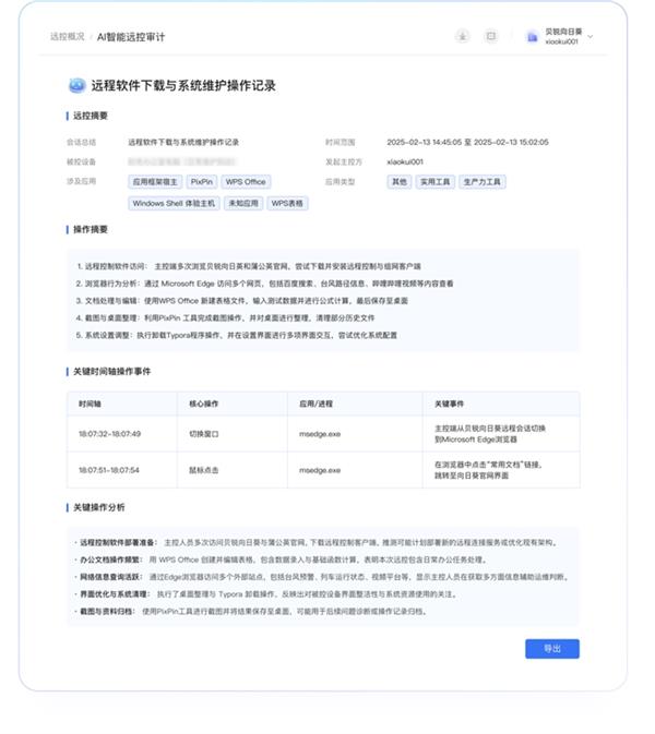 审计报告中包含远控全流程的AI分析、按时间轴输出的关键核心操作行为、具体的远程行为总结(如拷贝文件、修改配置等)等要素,可大幅提升企业对远程控制行为进行追溯审计的效率。